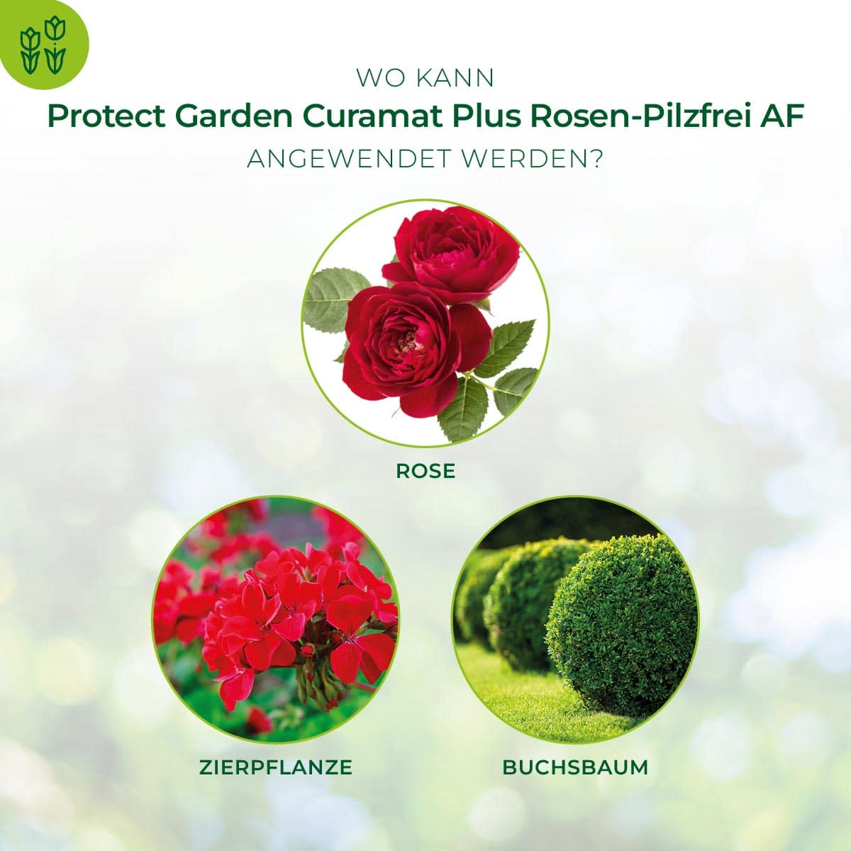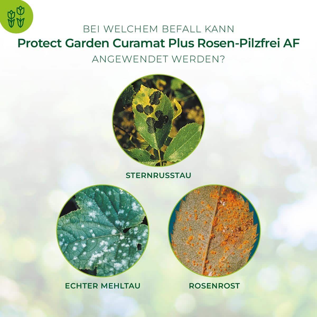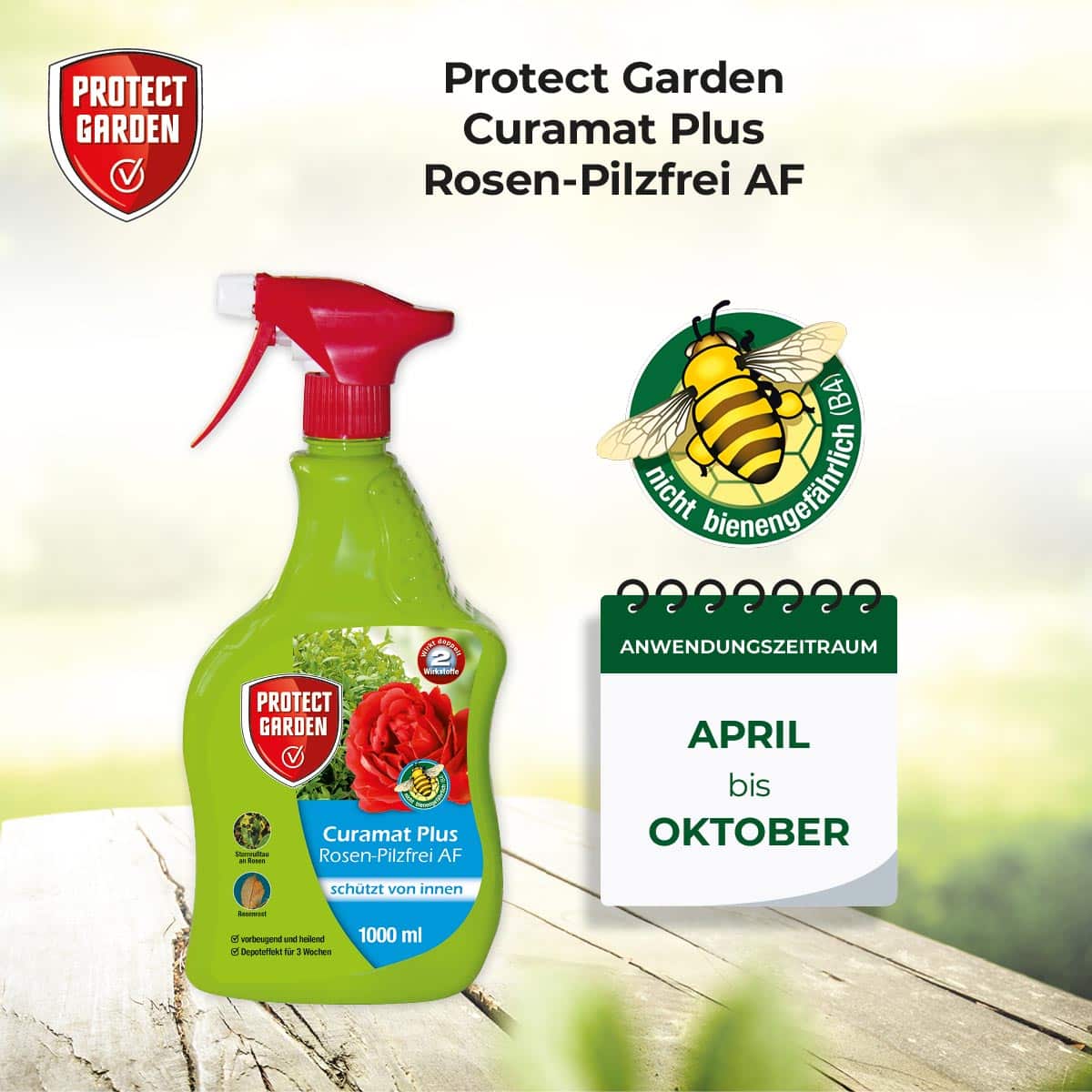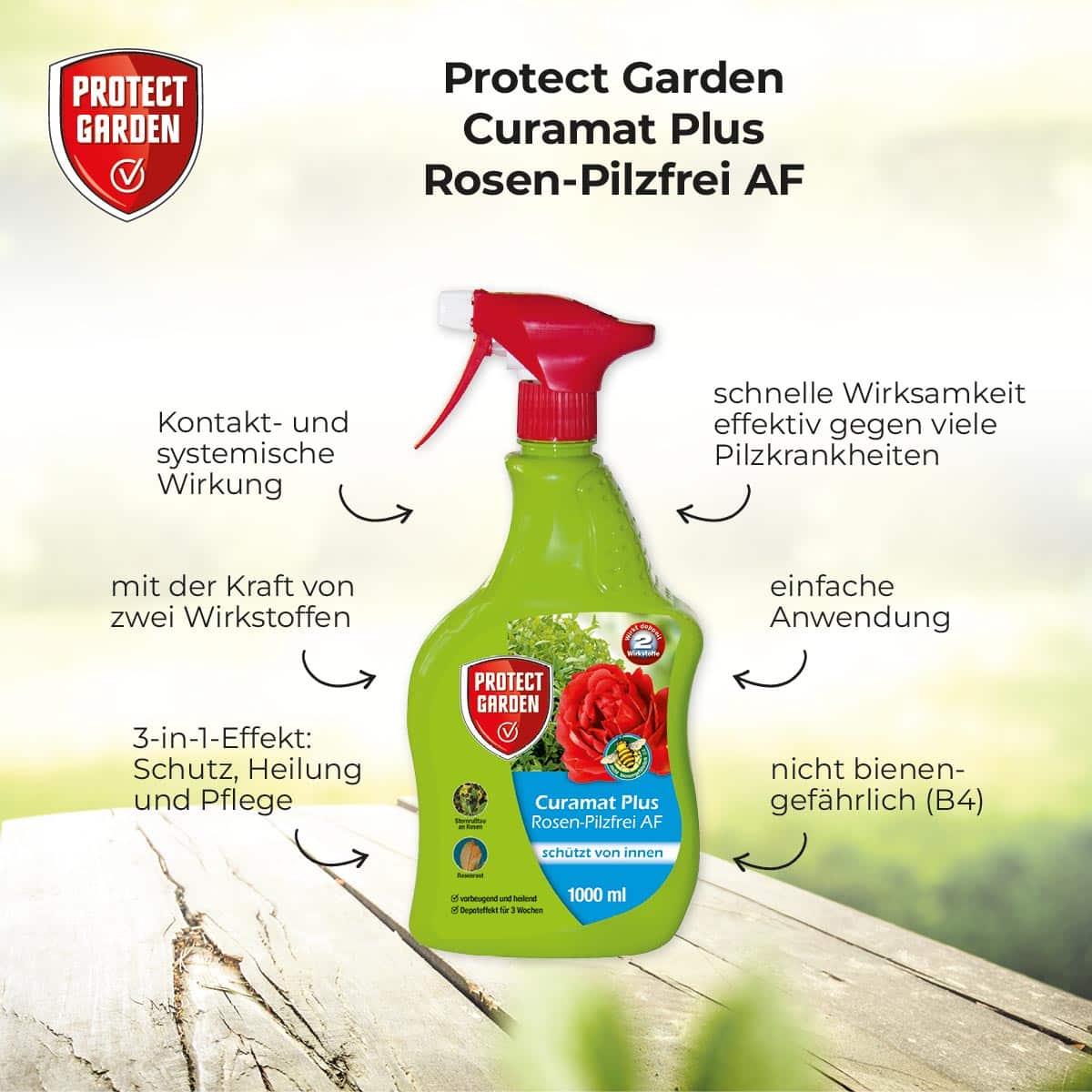 Das anwendungsfertige Pumpspray Curamat Plus Rosen-Pilzfrei AF verbindet eine bequeme Anwendung mit einer hervorragenden Wirkung gegen Pilzkrankheiten an Rosen (Echter Mehltau, Rost, Sternrußtau) und Zierpflanzen (Echter Mehltau und Rost), sowie aus eigener Erfahrung in der Nebenwirkung gegen Blattfleckenkrankheiten, Triebsterben an Buchsbaum (Cylindrocladium buxicola). Curamat Plus Rosen-Pilzfrei AF enthält 2 Wirkstoffe mit unterschiedlichen Wirkmechanismen und verfügt sowohl über eine Kontakt- als auch über eine systemische Wirkung. Schutz, Heilung, Pflege in einem – Curamat Plus Rosen-Pilzfrei AF wirkt vorbeugend und heilend und ist sehr gut pflanzenverträglich.