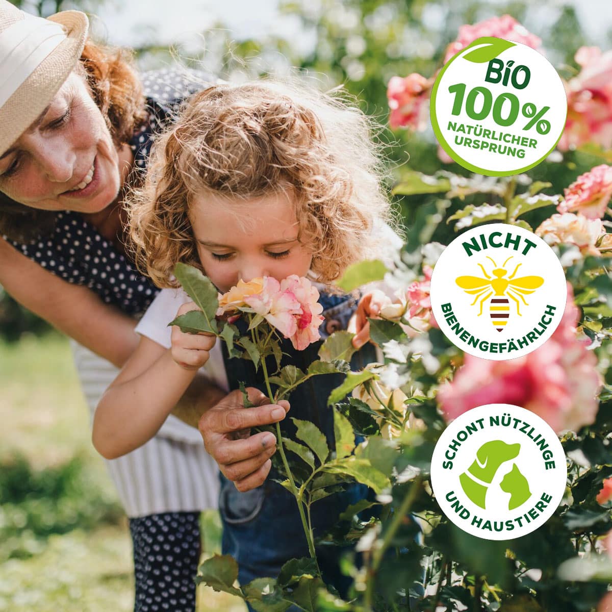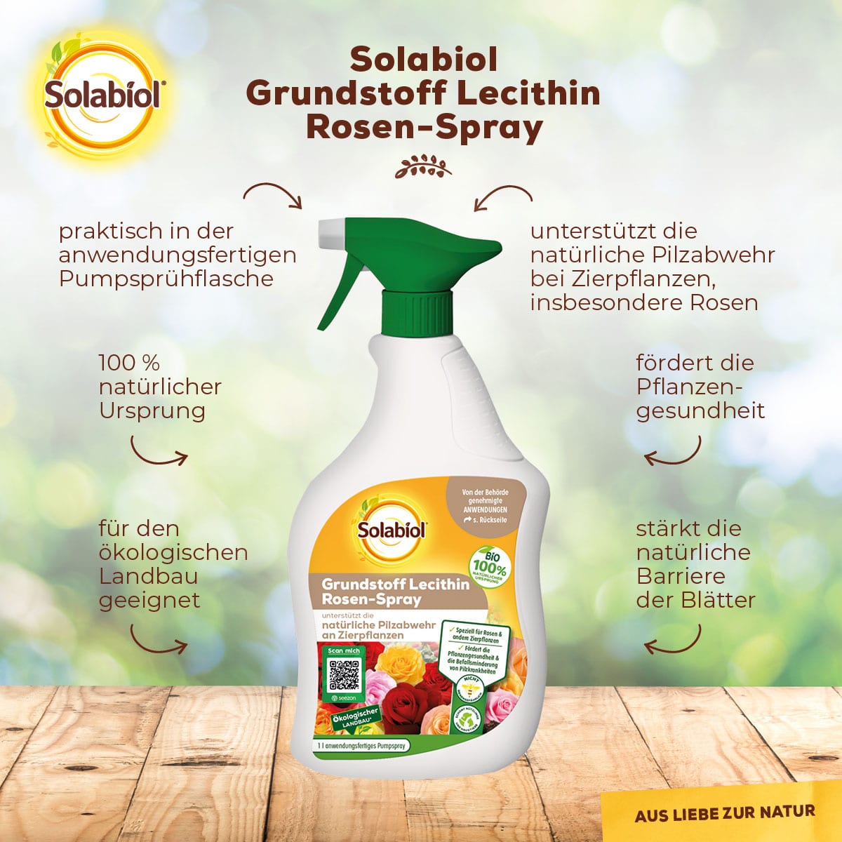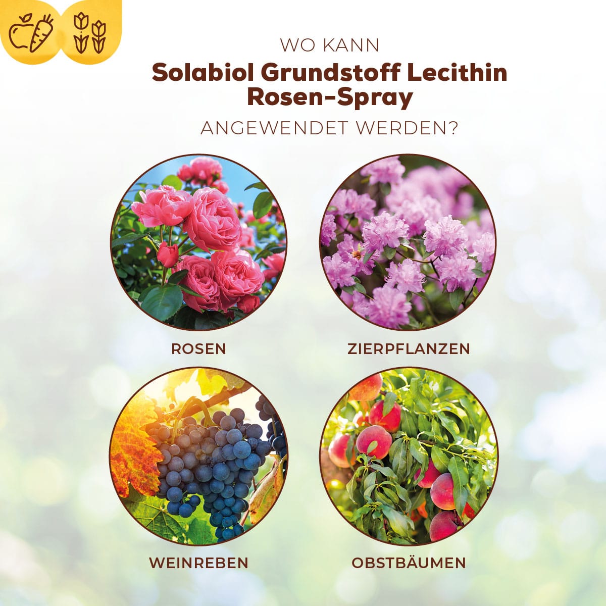 Das Solabiol Grundstoff Lecithin Rosen-Spray unterstützt die natürliche Abwehr von Pilzkrankheiten an Rosen und fördert die Pflanzengesundheit. Bei rechtzeitiger, vorbeugender Ausbringung wird die Sporenkeimung verschiedener Blattpilze gehemmt und die natürliche Barriere der Blätter gestärkt. Genehmigte Anwendungen* sind: Als Fungizid gegen Echter Mehltau und Kräuselkrankheit.