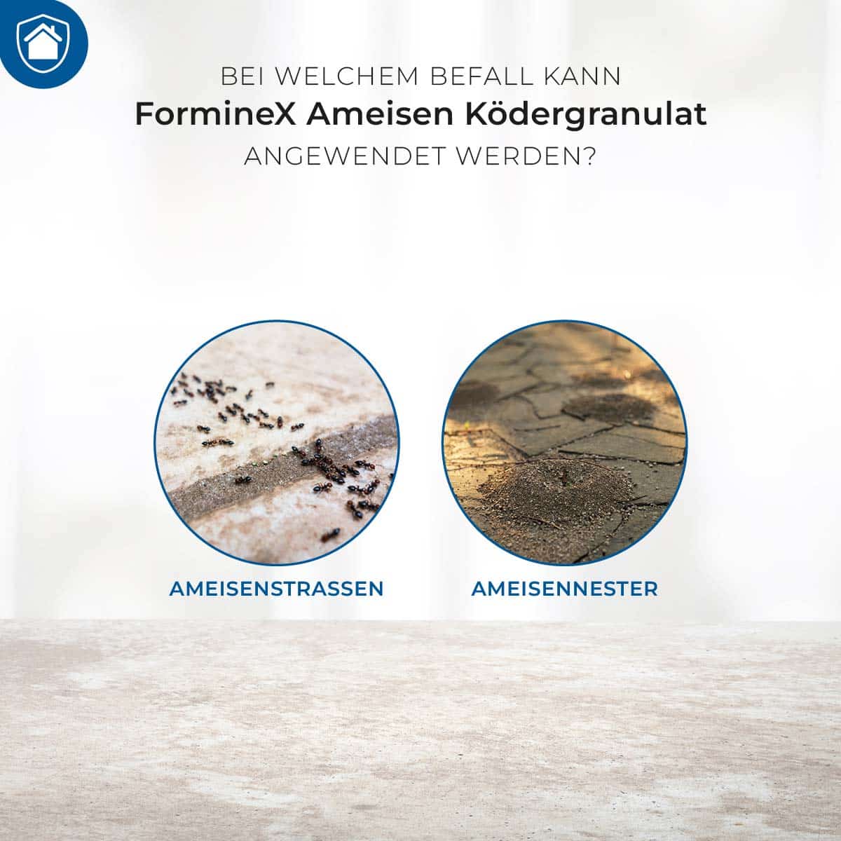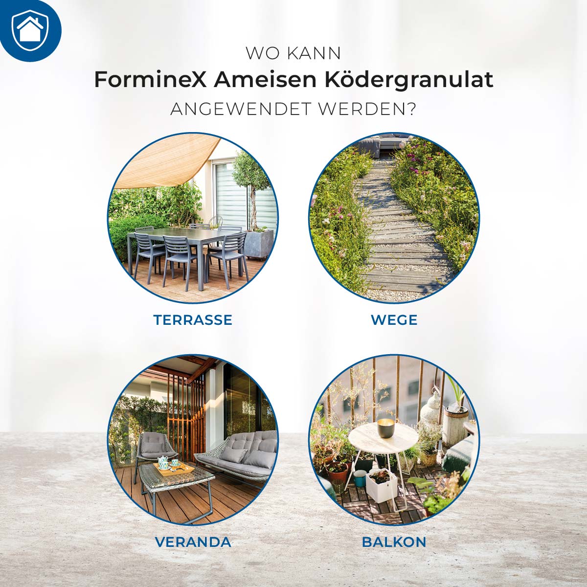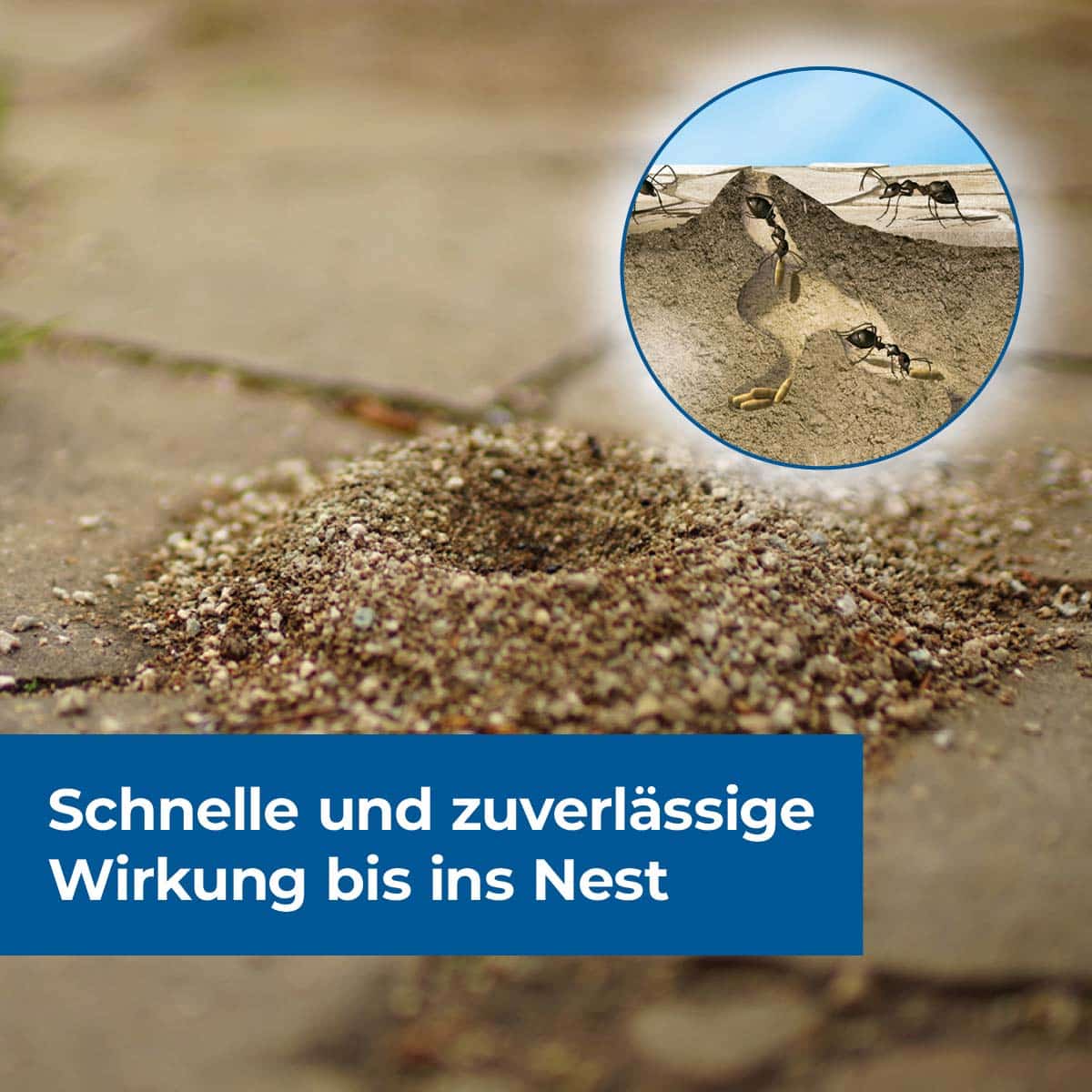 Dank der sehr guten Köderwirkung ist Ameisen Ködergranulat hervorragend gegen Ameisen einsetzbar. Neben Ameisen wirkt das Produkt auch gegen Kellerasseln, Tausendfüßler und anderes kriechendes Ungeziefer auf Terrassen, Balkonen und Wegen. In Nestnähe ausgestreut, schleppen Ameisen, angelockt durch den attraktiven Fraßköder, das Granulat in den Ameisenbau. Ameisen Ködergranulat überzeugt zudem durch seine Langzeitwirkung, sodass schon nach einmaliger Anwendung ein deutlicher Effekt eintritt.