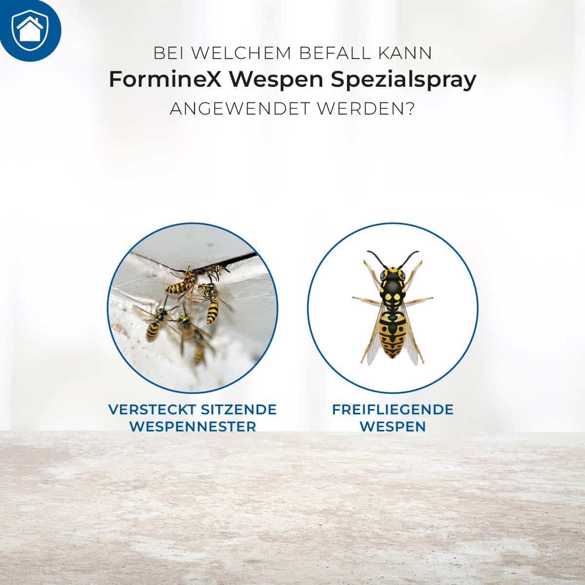 Zur gezielten Bekämpfung von frei fliegenden Wespen** und schwer zugänglichen Stellen, wie Löcher, Ritzen und Fugen. Dank des innovativen Doppelsprühsystems ist das Sprührohr mit nur einem Handgriff anwendbar. Das FormineX Wespenspray wirkt aufgrund der starken K.O.-Wirkung schnell und dauerhaft zur Abwehr freifliegender Wespen und zur Bekämpfung von Wespennestern.