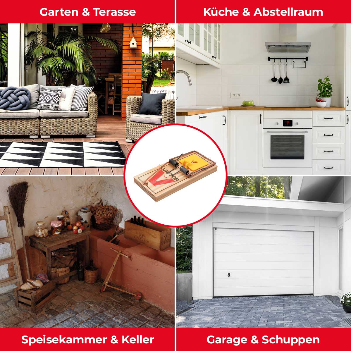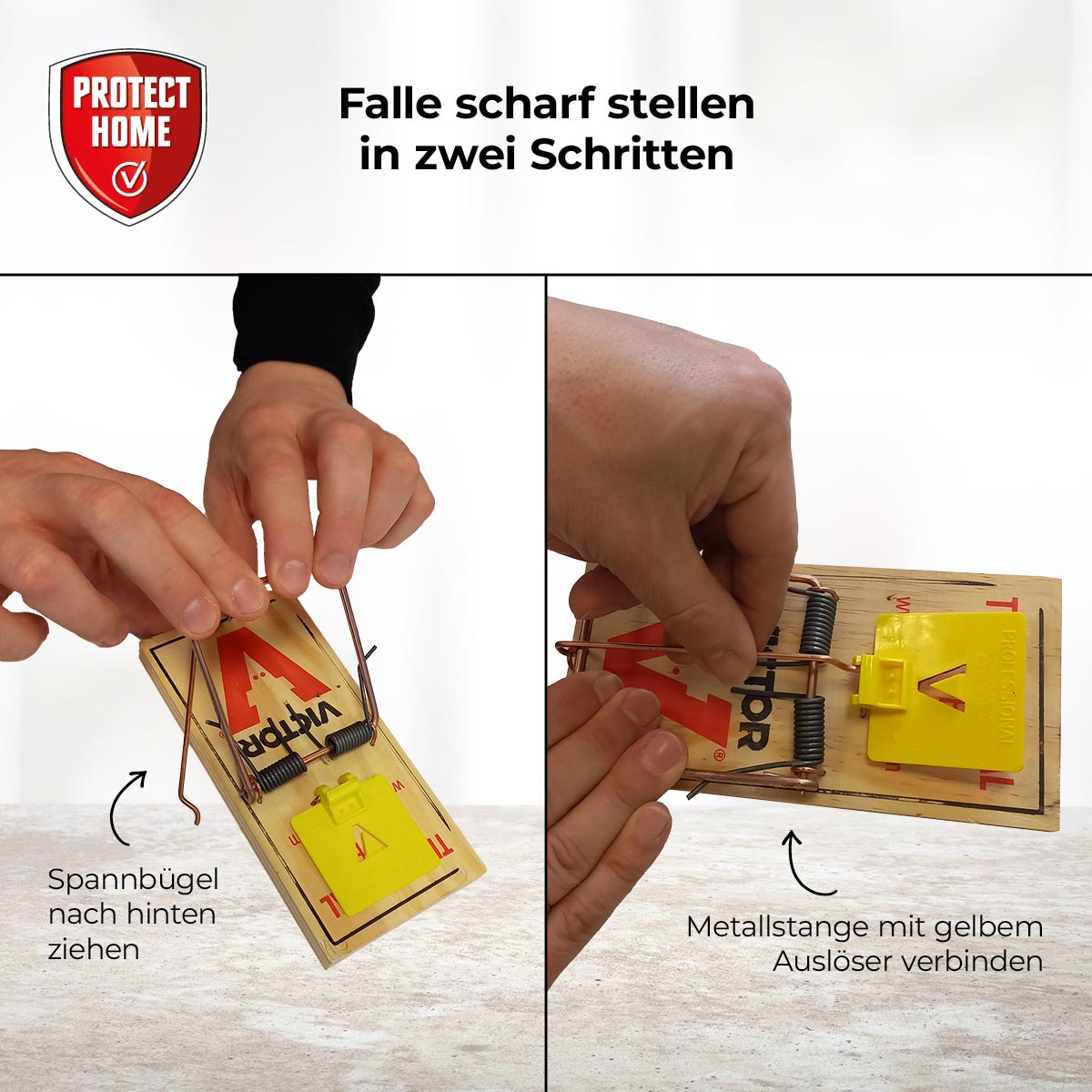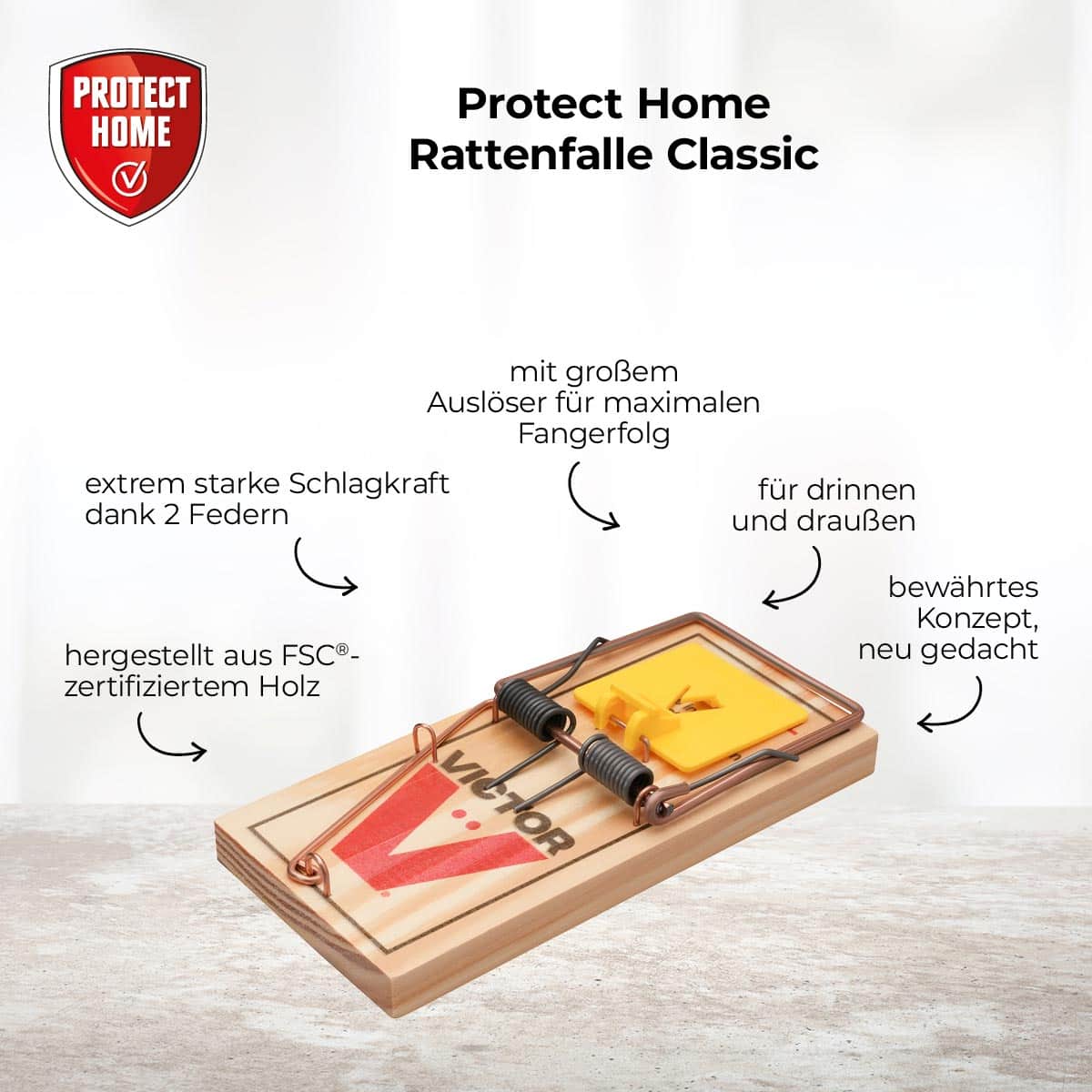 Die Protect Home Rattenfalle Classic ist eine klassische, bewährte Rattenfalle aus Holz. Sie eignet sich ideal zur giftlosen Bekämpfung von Rattenbefall im und am Haus. Sie kann unter anderem in Waschküchen, Kellern, auf Dachböden oder im Außenbereich angewendet werden. Die Ratten-Falle zeichnet sich durch eine enorme Schlagkraft und eine gleichzeitig einfache Anwendung aus.