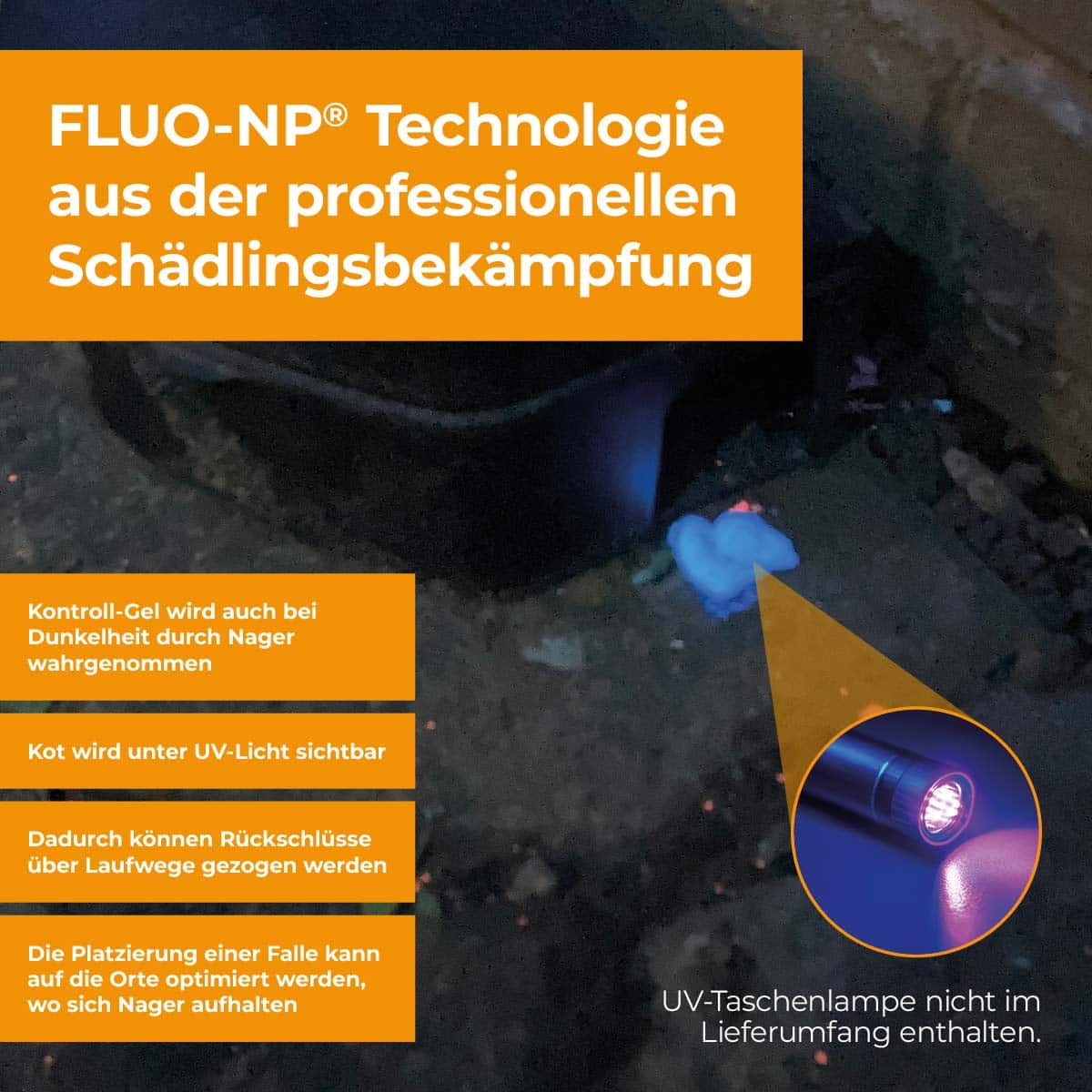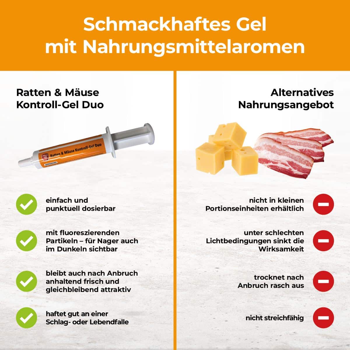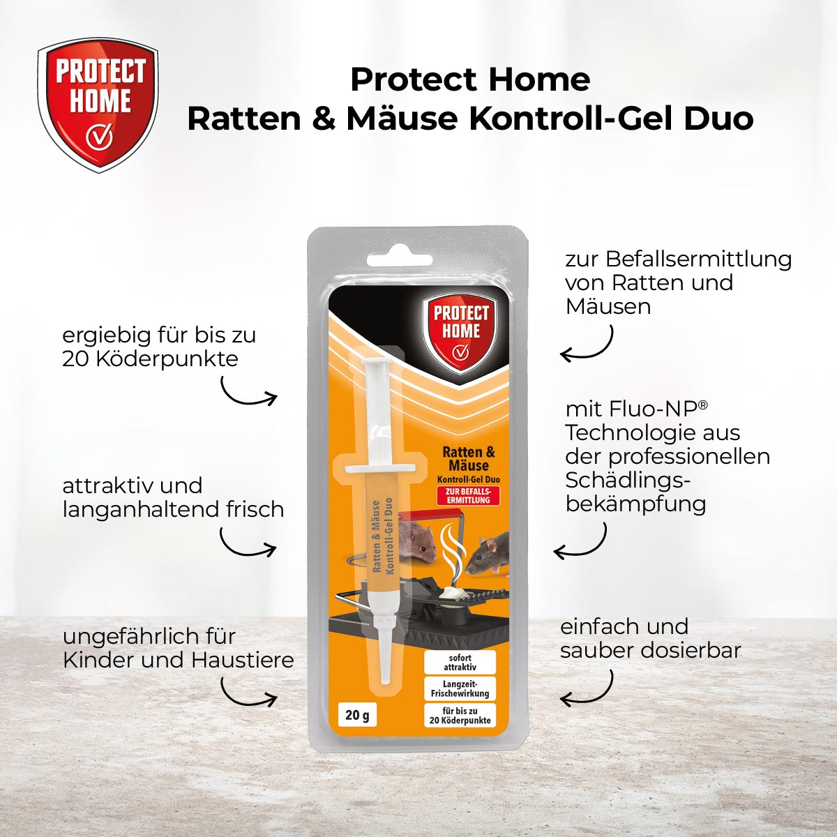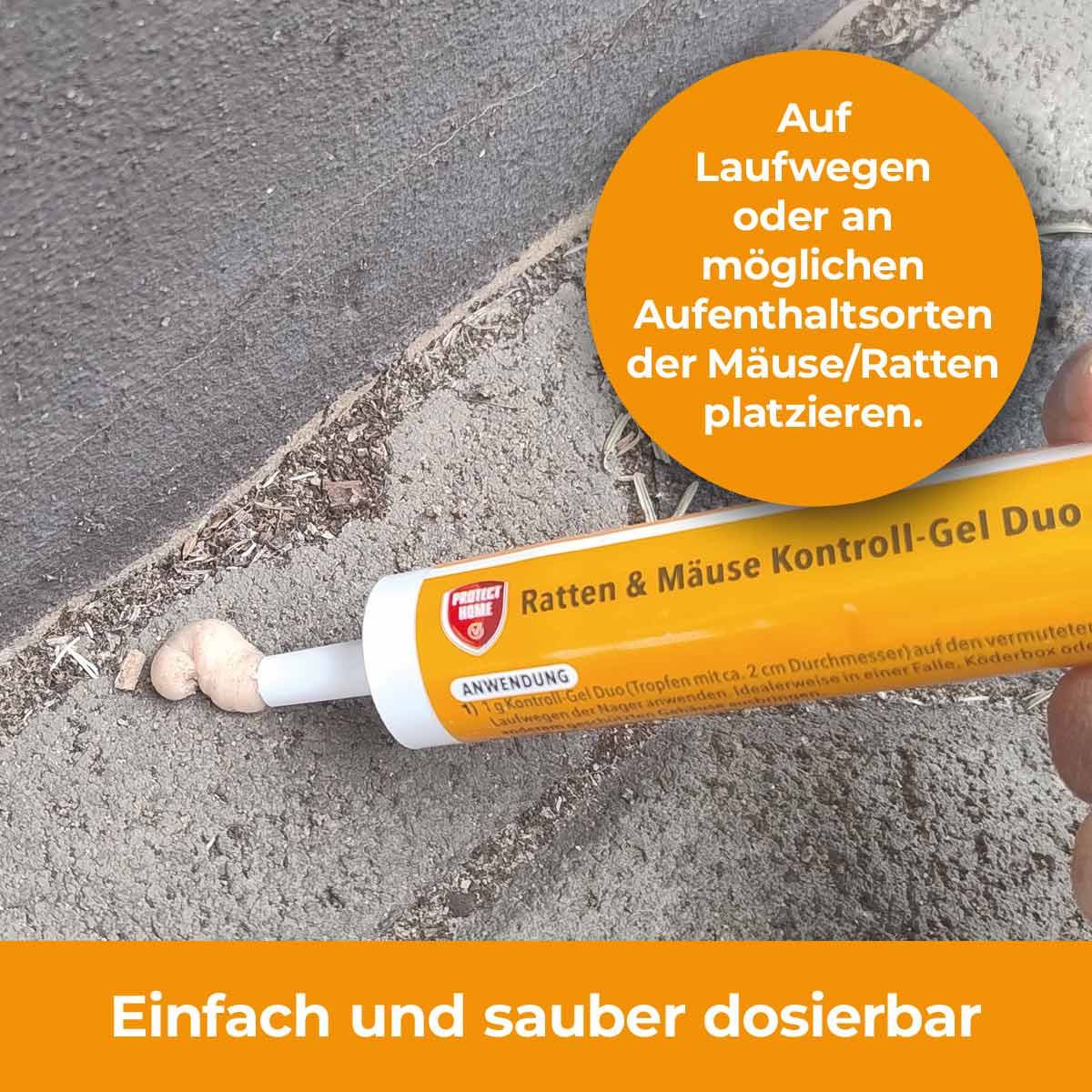 Spritze mit für Nager schmackhafter Gel-Formulierung zum Nachweis eines Befalls. Das Gel enthält Nahrungsaromen und fluoreszierende Partikel. Die fluoreszierenden Partikel sorgen u. a. dafür, dass das Gel auch bei Dunkelheit von den Nagern wahrgenommen und als interessant empfunden wird. Der Nachweis eines Befalls über Sichtkontrolle (Fressen des Gels) oder über Sichtbarmachen von Rückständen unter UV-Licht (Kotspuren auf Laufwegen und Aufenthaltsorten der Nager). Kontroll-Gel Duo eignet sich zudem ideal zur Vorbereitung einer Bekämpfung mit Schlagfallen.