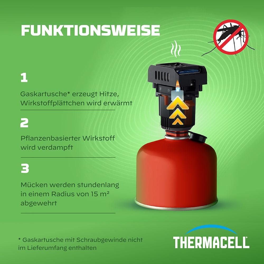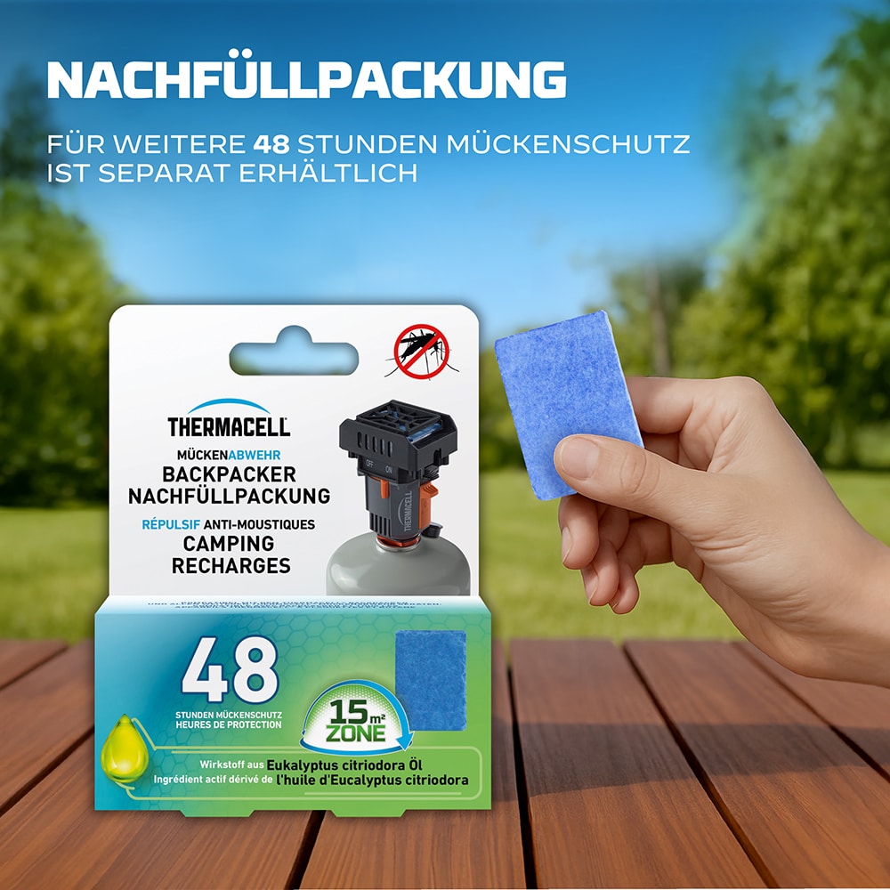 Draußen entspannt unterwegs sein und lästigen Mücken keine Chance geben: Der Thermacell Backpacker bietet zuverlässigen Mückenschutz für längere Trekking-Touren und Vanlife ohne Spray oder Lotion auf der Haut! Dank seines kompakten Designs und dem Betrieb mit handelsüblichen Schraubventil-Gaskartuschen ist der Backpacker flexibel einsetzbar. Der pflanzenbasierte Wirkstoff auf Basis von Zitronen-Eukalyptus-Öl erzeugt dabei gleichzeitig einen leichten, angenehmen Duft.